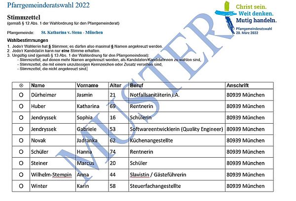 | Briefwahlunterlagen können ab sofort über das Pfarrbüro beim Wahlausschuss beantragt werden und werden ab 28. Februar 2022 ausgegeben. Die Wahlbriefe müssen bis spätestens Freitag, 18. März 2022 um 10:00 Uhr beim Wahlausschuss eingegangen sein. |